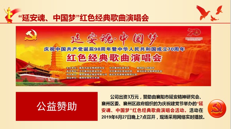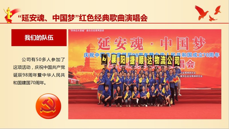 1、迎“七一”我支部贊助“延安精神研究會”經(jīng)費(fèi),并組建方陣觀看“延安魂、中國夢”紅色經(jīng)典歌曲演唱會,讓員工重溫昔日先烈風(fēng)彩,激昂工作熱情。