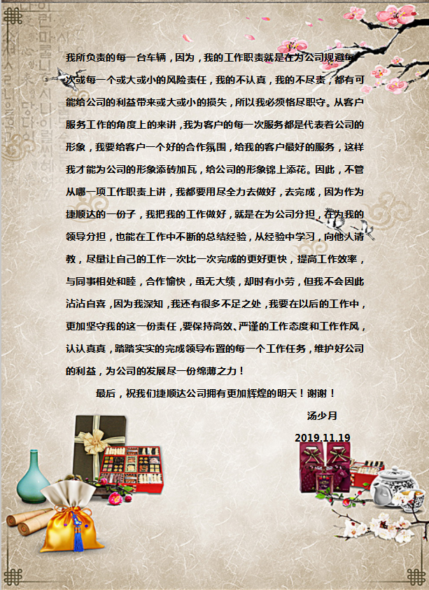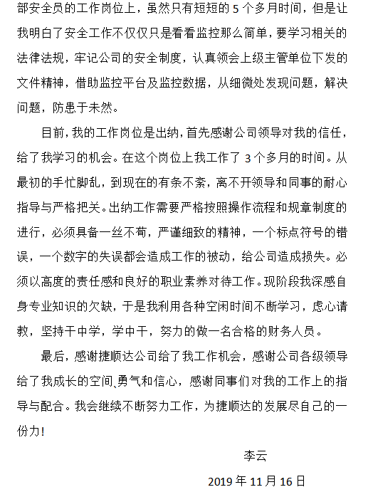 在11月份落實(shí)公司下發(fā)的《關(guān)于增強(qiáng)“傳幫帶”企業(yè)文化的通知》中,有崔建林、湯少月、李云3名工齡增長(zhǎng)的員工參與到這項(xiàng)工作中來,3名員工總結(jié)了自己入職以來的成長(zhǎng)歷程與工作經(jīng)驗(yàn)。經(jīng)過評(píng)審,李云的工齡成長(zhǎng)感悟,寫出了入司4年以來在3個(gè)崗位不斷學(xué)習(xí),不斷成長(zhǎng)。根據(jù)文件規(guī)定對(duì)李云獎(jiǎng)勵(lì)50元,獎(jiǎng)金在2019年11月份工資中發(fā)放。工齡感悟分享從2019年1月開始至今,公司全員積極參與。在此,對(duì)支持這項(xiàng)工作的員工我們表示感謝,相信在捷順達(dá)的大家庭中,我們都能學(xué)習(xí)到更多的有用的知識(shí)。