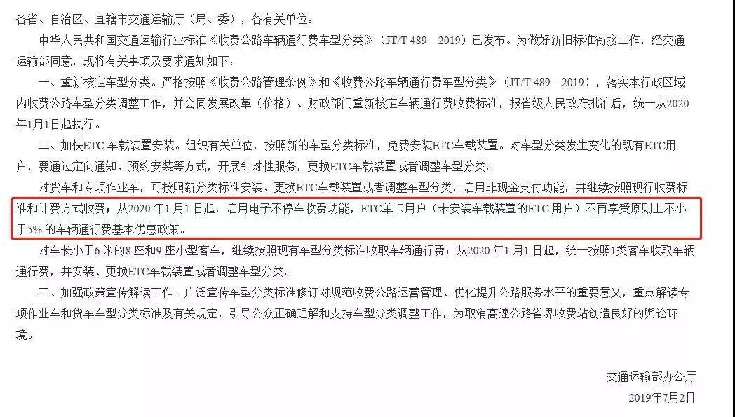交通運(yùn)輸部發(fā)布的《收費(fèi)公路車輛通行費(fèi)車型分類》中說明,自2020年1月1日起,啟用電子不停車收費(fèi)功能,ETC單卡用戶(未安裝車載裝置的ETC用戶)不再享受原則上不小于5%的車輛通行費(fèi)基本優(yōu)惠政策。