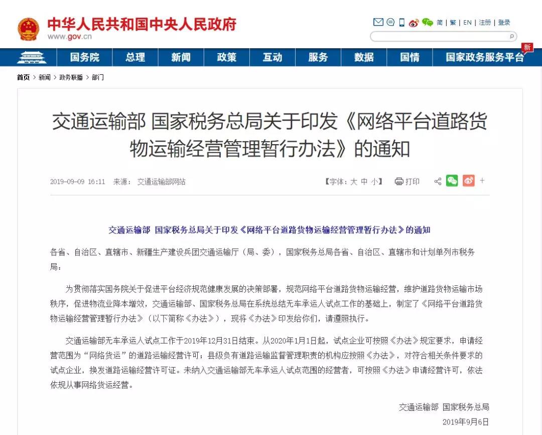 2019年9月9日,交通運(yùn)輸部發(fā)布《網(wǎng)絡(luò)平臺(tái)道路貨物運(yùn)輸經(jīng)營管理暫行辦法》,自2020年1月1日起正式實(shí)施,有效期2年。