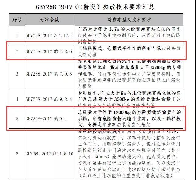 2019年10月28日,工業(yè)和信息化部裝備工業(yè)發(fā)展中心下發(fā)《關(guān)于落實(shí)GB 7258-2017等標(biāo)準(zhǔn)整改工作的通知》。通知規(guī)定,從2020年1月1日開始,三軸的欄板式和倉柵式掛車將強(qiáng)制配備盤式剎車,同時(shí)總質(zhì)量大于12000kg的三軸欄板式、倉柵式半掛車都應(yīng)裝備空氣懸掛。