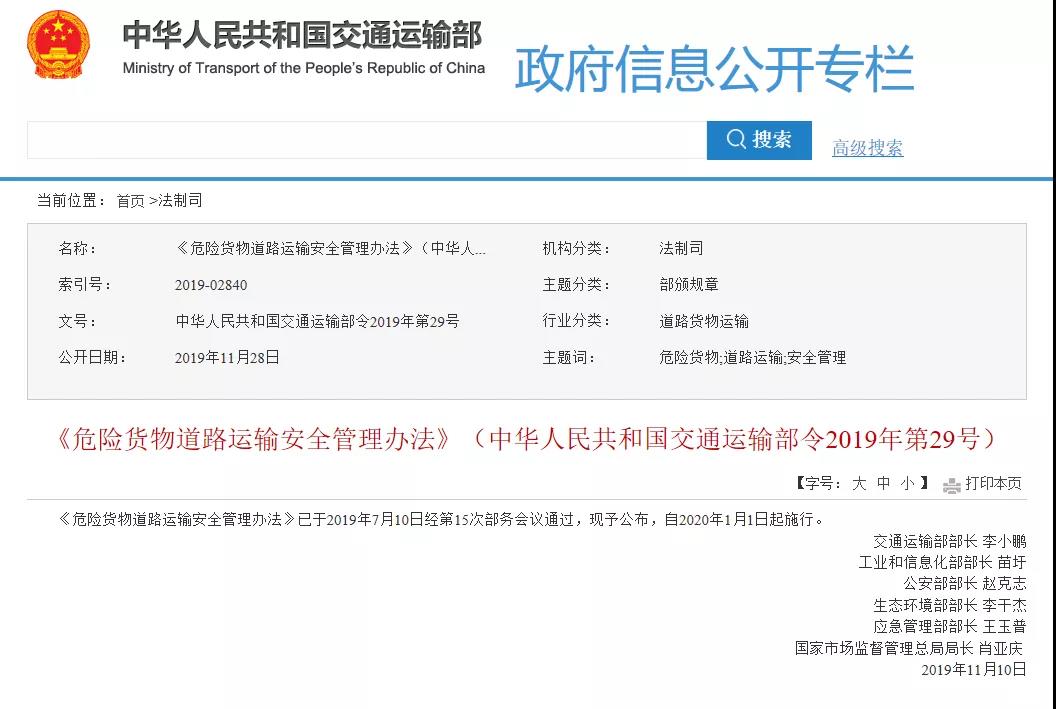 2019年11月28日,交通運(yùn)輸部發(fā)布《危險(xiǎn)貨物道路運(yùn)輸安全管理辦法》,該管理辦法自2020年1月1日起正式執(zhí)行。