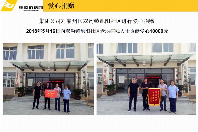 襄陽捷順達(dá)物流有限公司,企業(yè)發(fā)展13年,堅(jiān)持公益事業(yè)10年。把回報(bào)社會(huì)、傳遞溫暖當(dāng)成是企業(yè)責(zé)任的擔(dān)當(dāng)、情懷的堅(jiān)守!