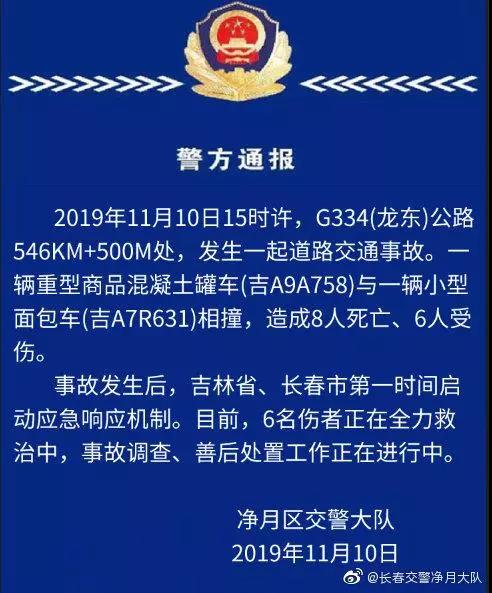 11月10日15時(shí)許,長(zhǎng)春G334(龍東)公路發(fā)生一起道路交通事故。一輛重型商品混凝土罐車與一輛小型面包車相撞,造成8人死亡、6人受傷。